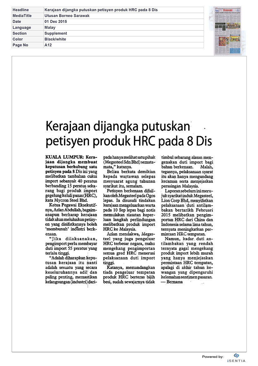 Kerajaan dijangka putuskan petisyen produk HRC pada 8 Dis