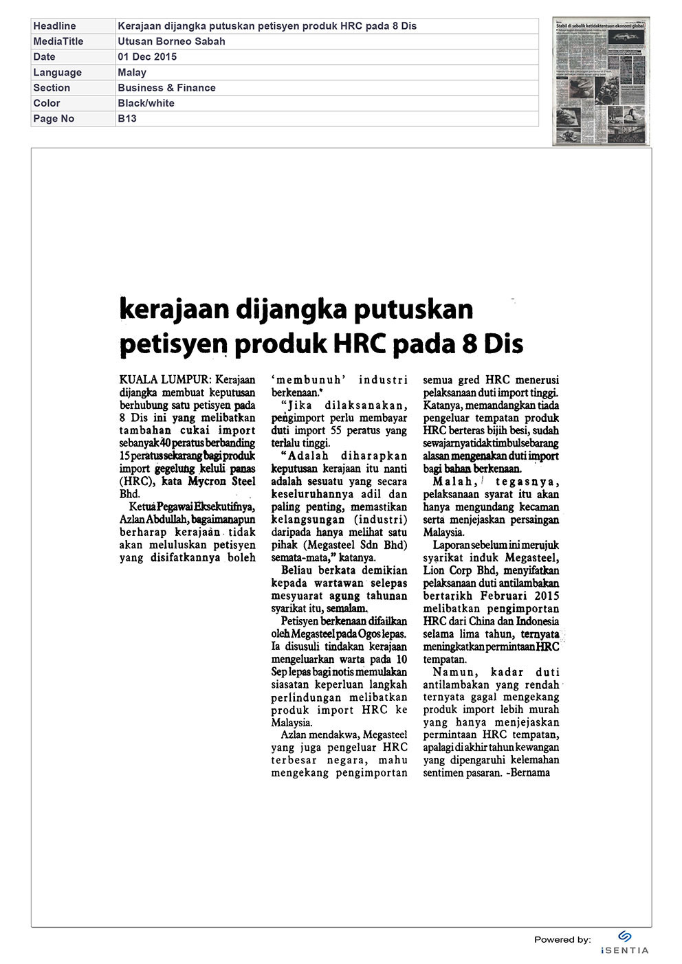 Kerajaan dijangka putuskan petisyen produk HRC pada 8 Dis